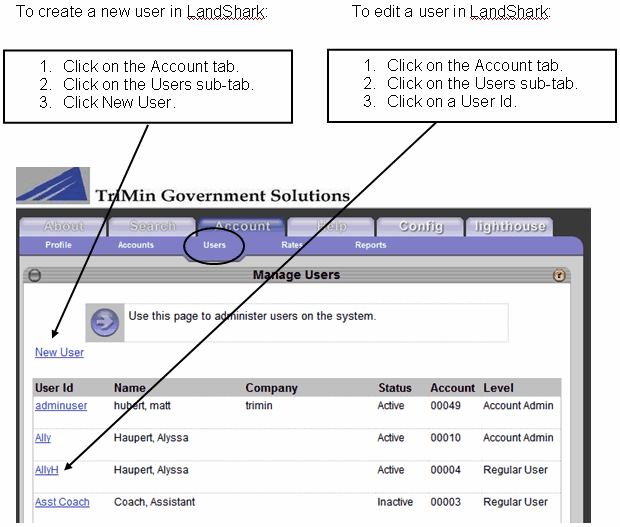 User Levels: Regular User – Can conduct searches, use the help tab and access their own user profile. Account Admin – Can do functions of a Regular User, plus has the ability to add users to their own account. Super User – This user can add accounts, add users and access all areas of LandShark.