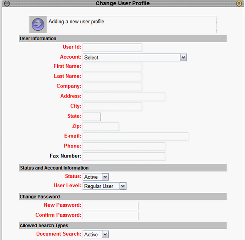The user profile screen will appear. If you are changing existing user information, the fields will be populated already.
