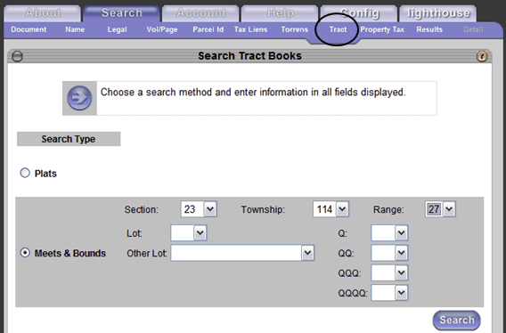 | 1. | Select to search by Plats or by Metes and Bounds. |